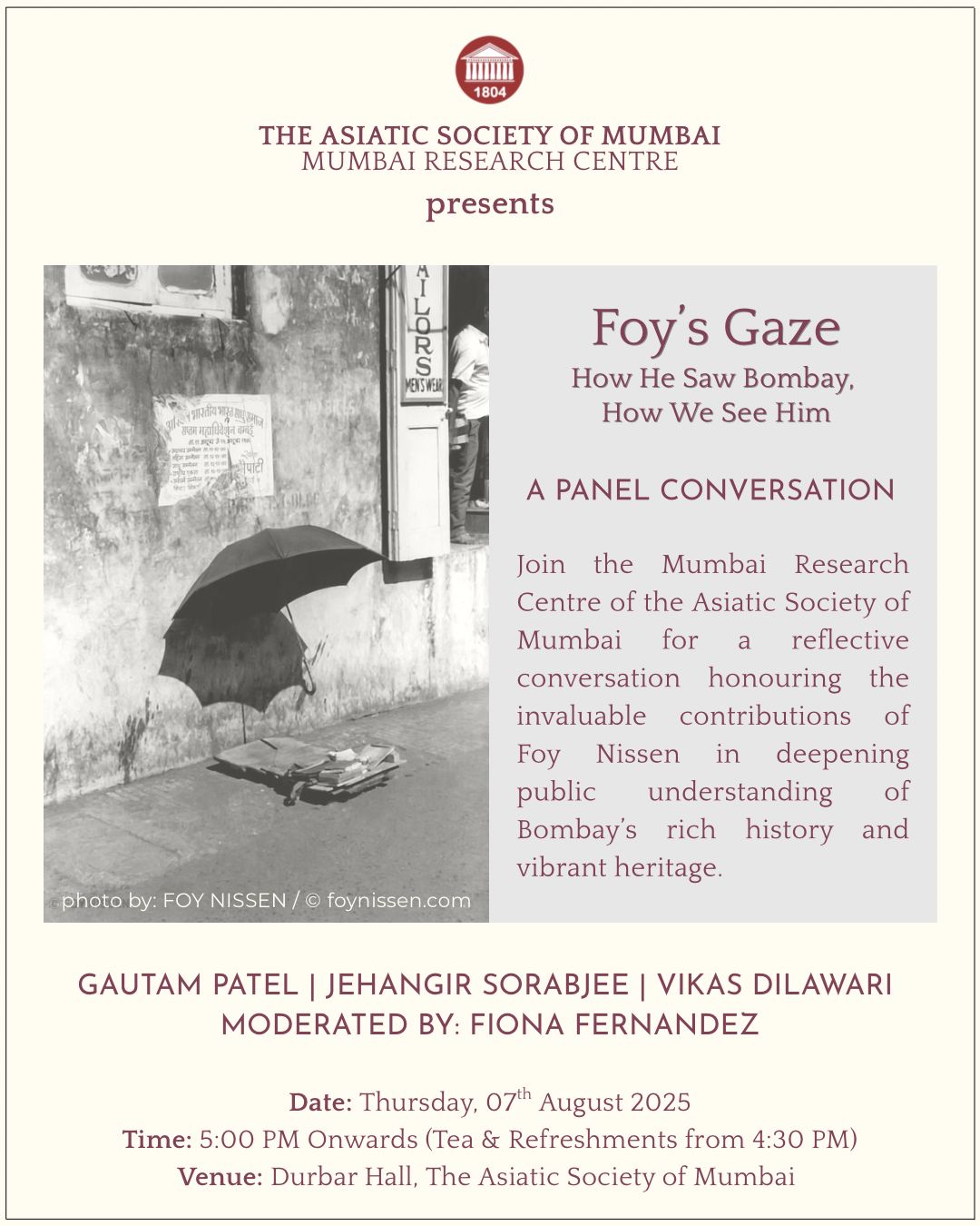 Join the Mumbai Research Centre of the Asiatic Society of Mumbai for a reflective conversation honouring the invaluable contributions of Foy Nissen in deepening public understanding of Bombay's rich history and vibrant heritage.