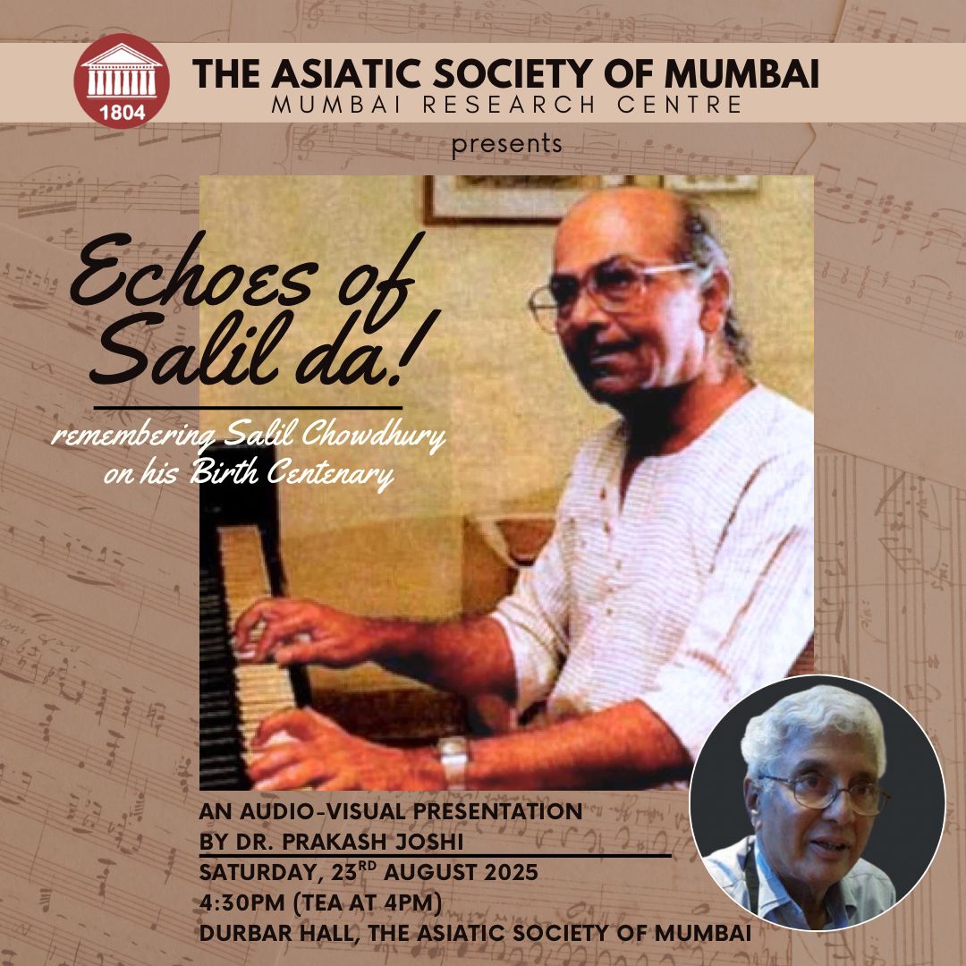 Join us for an evening celebrating the genius of Salil Chowdhury — composer, poet, and visionary! His timeless melodies and socially conscious lyrics revolutionized Indian film music. The Mumbai Research Centre of the Asiatic Society of Mumbai invites you to an audio-visual presentation by Dr. Prakash Joshi, a columnist and music connoisseur. He will lead this tribute in honor of Salil Chowdhury’s birth centenary.