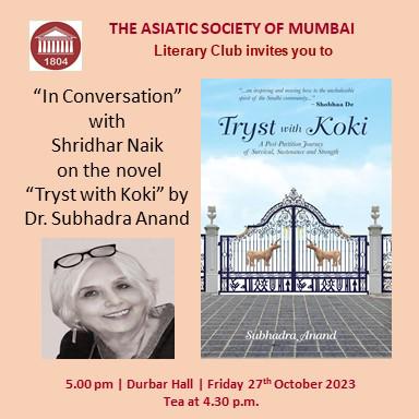 The Literary Club of the Asiatic Society of Mumbai is pleased to invite you to join us in conversation with the author Dr. Subhadra Anand, on her debut novel “Tryst with Koki”, on Friday 27th October 2023 at 5 pm in the Durbar Hall of the Society. She will be in conversation with our member Shridhar Naik, a media professional and author.