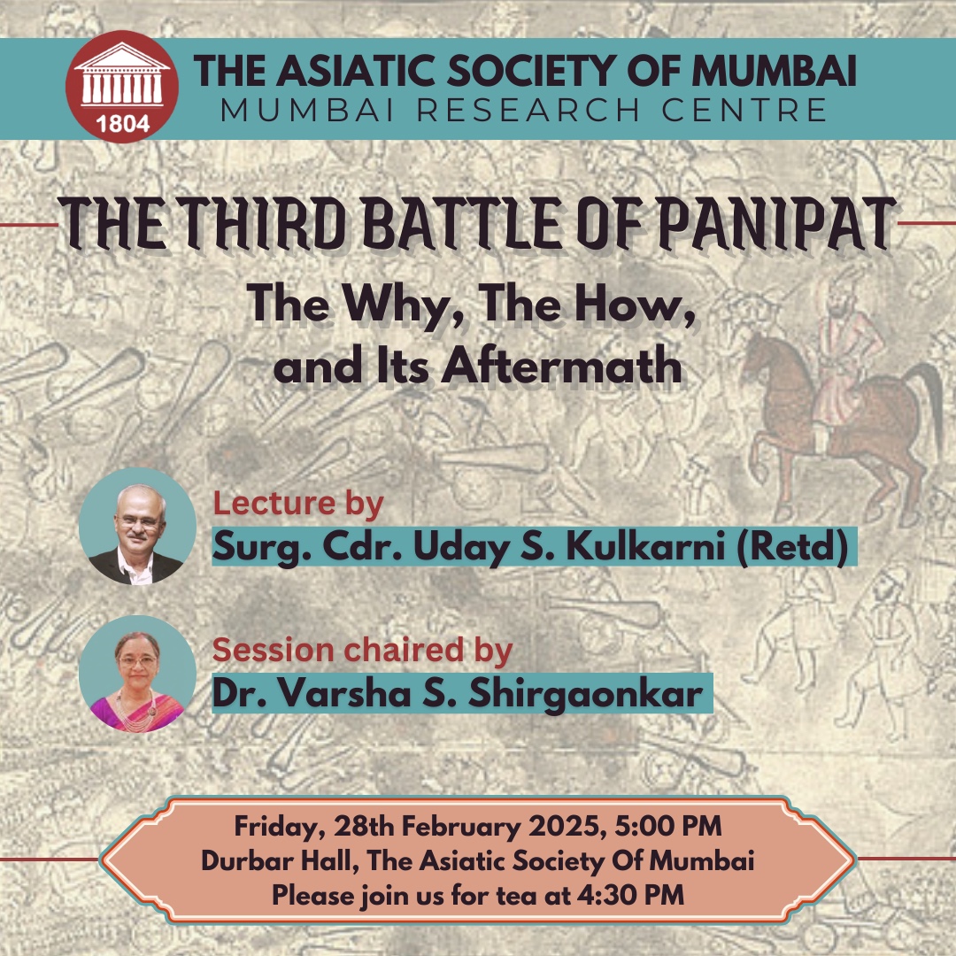 The Mumbai Research Centre of the Asiatic Society of Mumbai invites you to a lecture titled 'The Third Battle of Panipat: The Why, The How, and Its Aftermath' by Surg. Cdr. Uday S. Kulkarni (Retd). The session will be chaired by Dr. Varsha S. Shirgaonkar.
