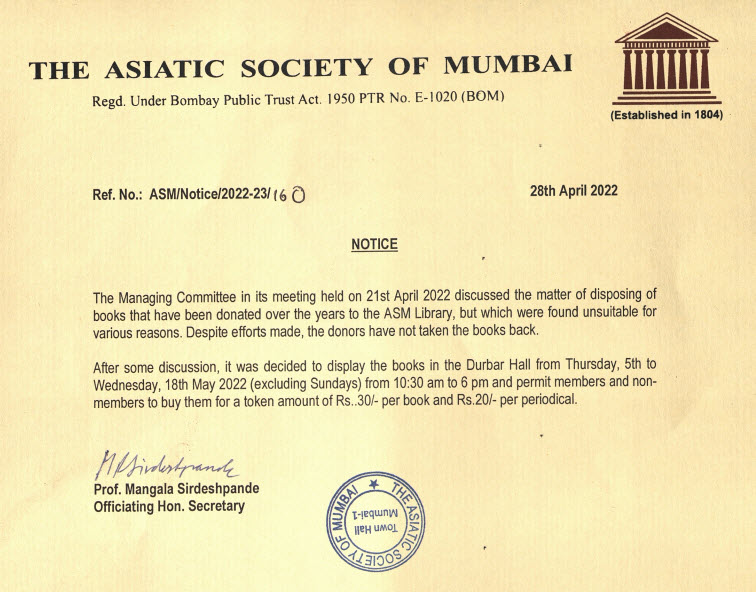 After some discussion, it was decided to display the books in the Durbar Hall from Thursday, 5th to Wednesday, 18th May 2022 (excluding Sundays) from 10:30 am to 6 pm and permit members and non-members to buy them for a token amount of Rs.30/- per book and Rs.20/- per periodical.