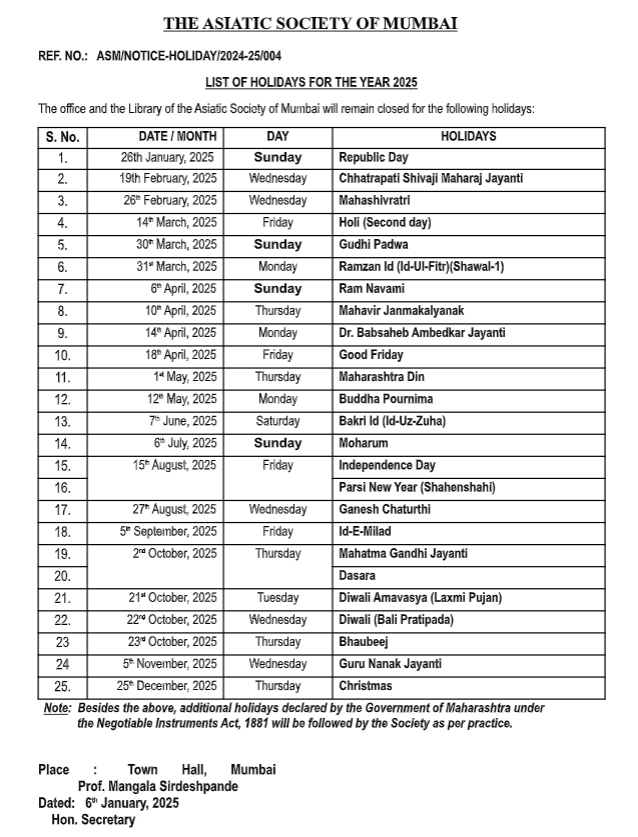 Due to heavy downpour and Red Alert in Mumbai City and the suburbs of Mumbai and Thane, and also disruption in train services due to water logging, it has been decided to close the Office and the Library of the Asiatic Society of Mumbai today, the 19th August, 2025.