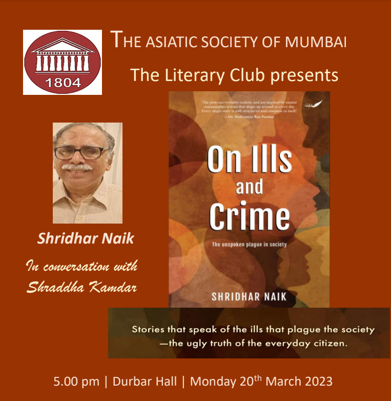 The Literary Club of the Asiatic Society of Mumbai is pleased to announce a presentation of a collection of stories titled “On Ills and Crime” by our Member, Shridhar Naik, on Monday 20th March 2023 at 5 pm in the Durbar Hall of the Society.
