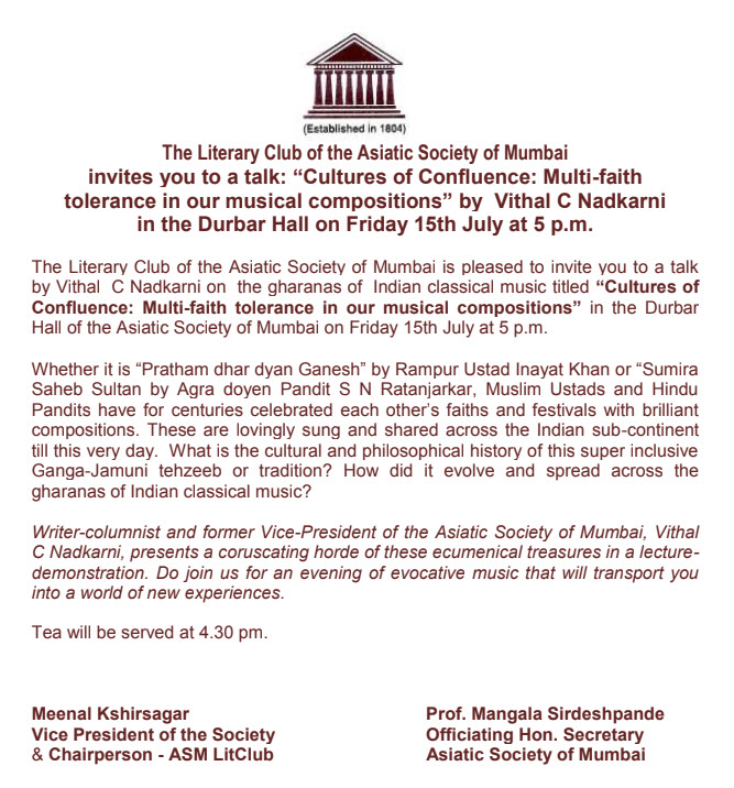 The Literary Club of the Asiatic Society of Mumbai is pleased to invite you to a talk by Vithal C Nadkarni on the gharanas of Indian classical music titled “Cultures of Confluence: Multi-faith tolerance in our musical compositions” in the Durbar Hall of the Asiatic Society of Mumbai on Friday 15th July at 5 p.m.
