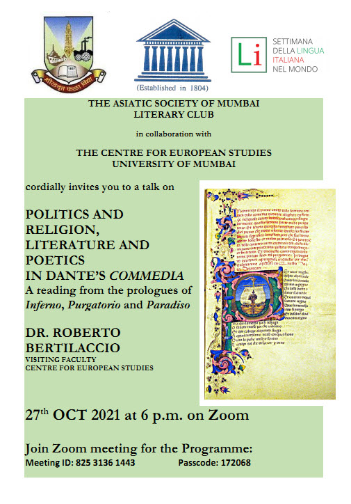 The Literary Club of the Asiatic Society of Mumba in collaboration with the Centre for European Studies, University of Mumbai and the Italian Cultural Institute invites you to an Online talk: Politics and religion, literature and poetics in Dante's Commedia A reading from the prologues of Inferno, Purgatorio and Paradiso by Dr. Roberto Bertilaccio on 27th October 2021 at 6 pm on Zoom